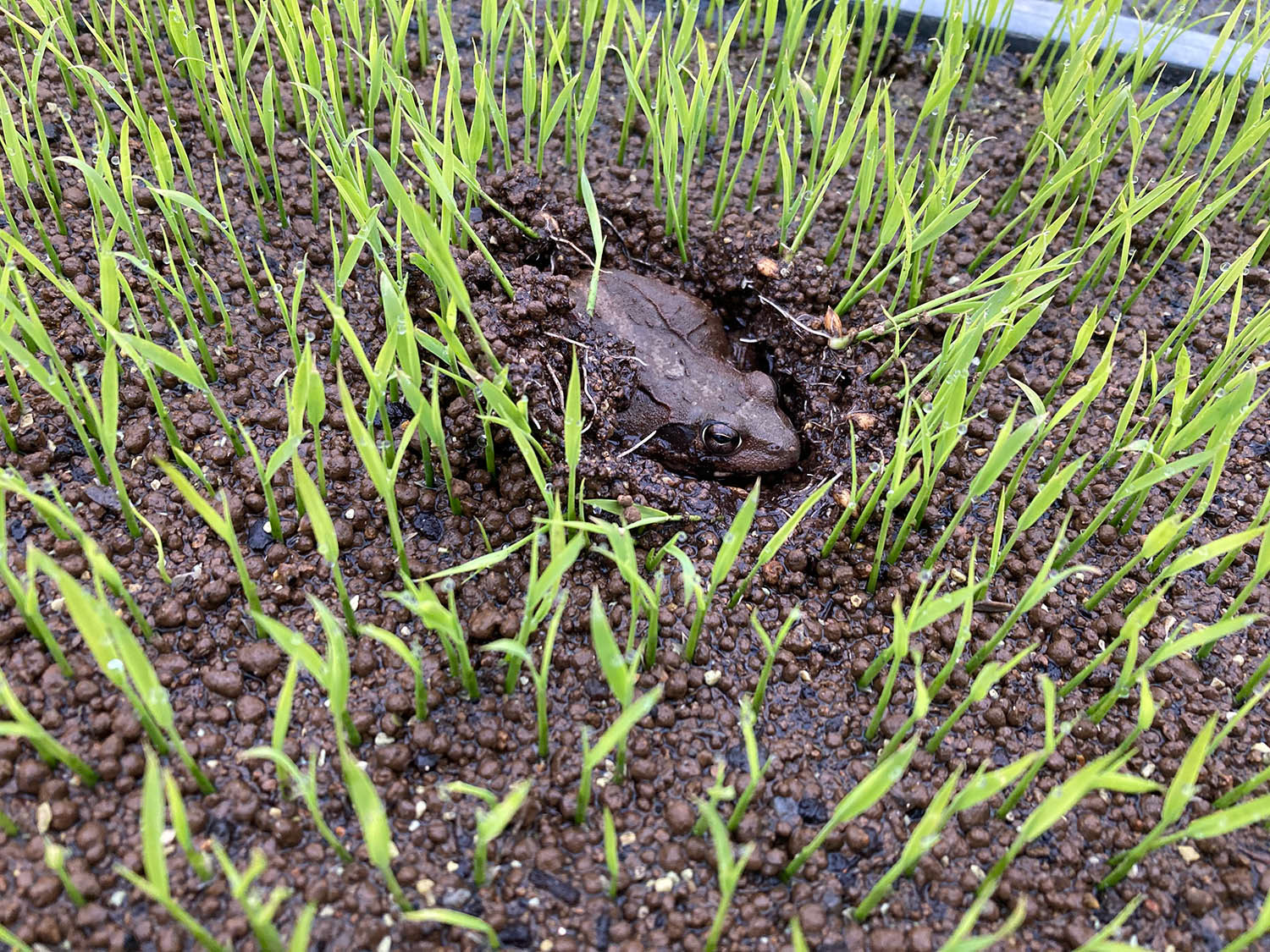 ハウスではなく露地で育苗をすると、オケラやカエルに苗をほじくり返されたりするが、徒長の心配がなく、病気にもなりにくく、寒さに強い、茎の太い苗になる。